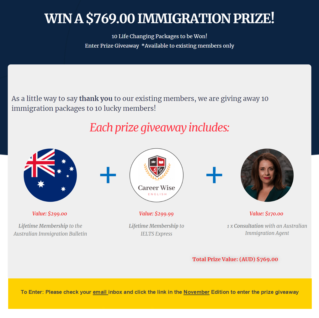 The winners of the November 2025 Immigration Prize Giveaway were drawn at 10am AEST on 1st November 2025..