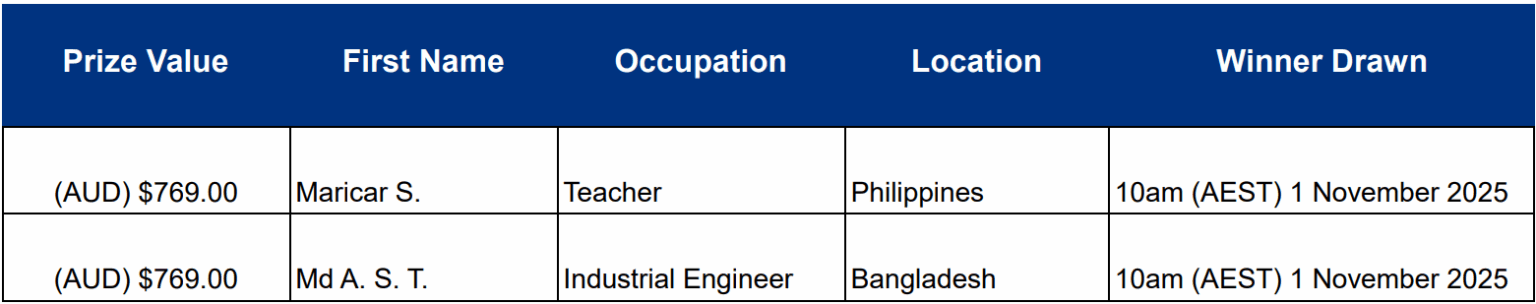 The next 2 lucky winners will be drawn at 10am AEST on 1st December 2025.