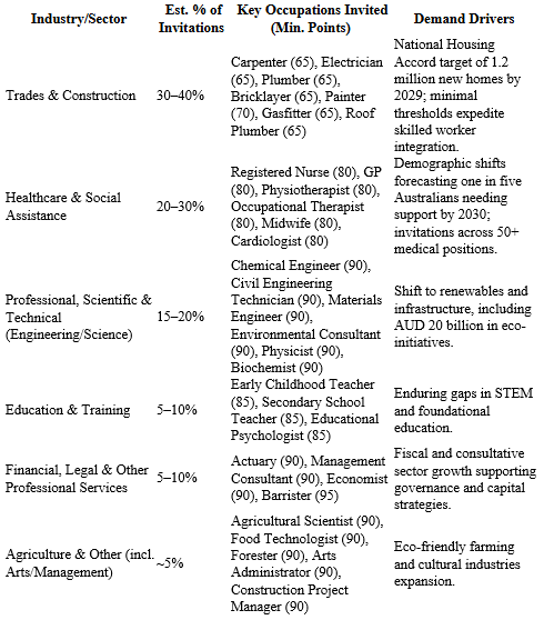 The Skilled Independent visa (subclass 189) continues to dominate migration outcomes, with the 21 August invitation round accounting for almost 98% of all invitations issued. Engineering, healthcare, and trades secured more than 70% of places, with minimum points thresholds ranging from 65 for critical trades to over 100 for specialist roles. Analysts highlight the subclass 189 program’s resilience and its role in filling shortages across essential industries.