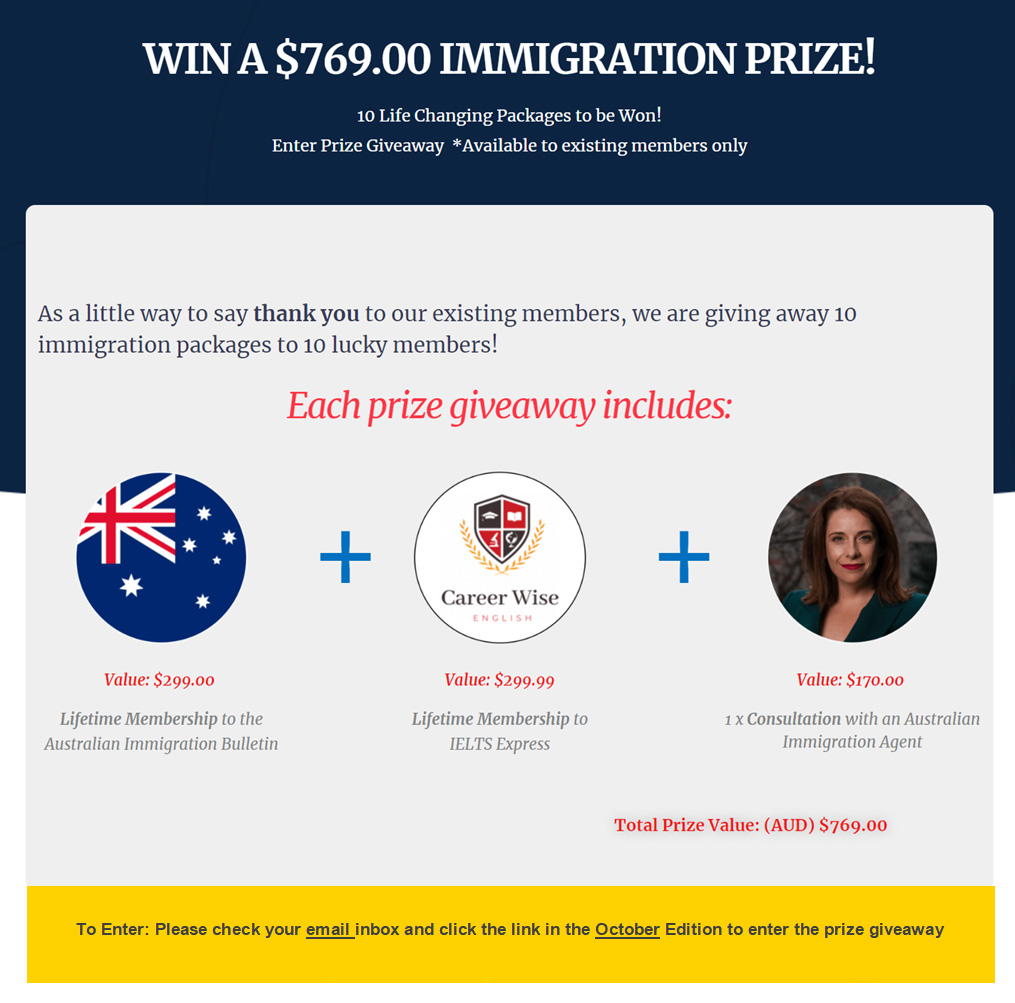 The winners of the October 2025 Immigration Prize Giveaway were drawn at 10am AEST on 1st October 2025.