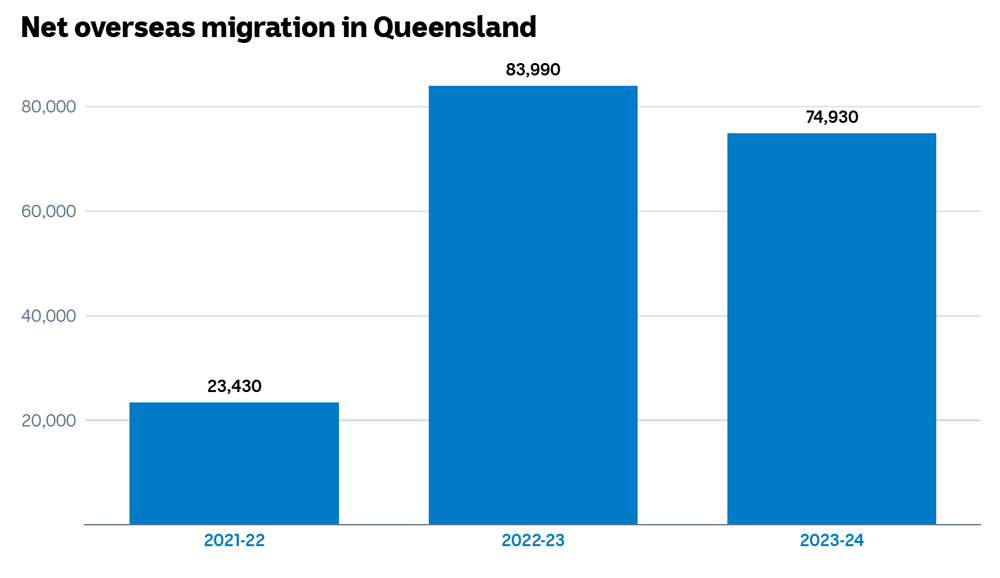 Almost 75,000 people moved from overseas to Queensland in that period, while almost 30,000 people shifted from interstate.
