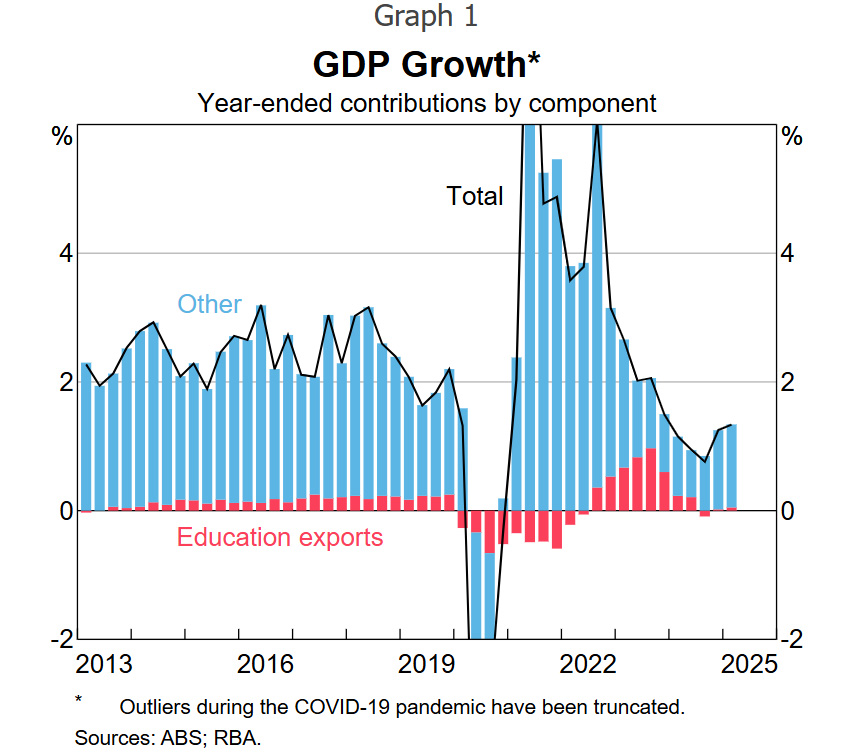 International students play a significant role in the Australian economy by spending on goods and services and providing labour for Australian businesses. The number of international students grew strongly after international borders reopened following the COVID-19 pandemic; education exports are currently Australia’s fourth largest category of export, at approximately $50 billion in 2023/24. International students have been an important driver of net overseas migration and GDP growth in recent years (Graph 1).