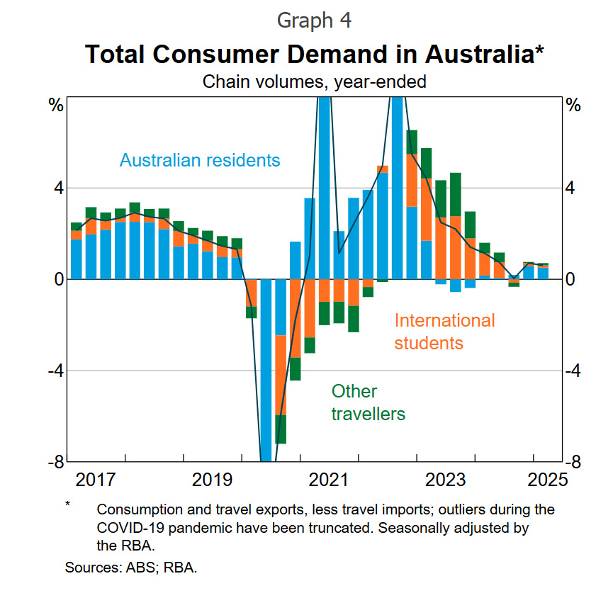 After Australia’s international borders reopened in late 2021, the number of international students onshore rose rapidly. While student arrivals quickly returned to around pre-pandemic levels, departures were lower because there were fewer students onshore to depart. Overall, these dynamics led to the international student stock rising sharply from just under 300,000 in 2022 to 560,000 by the end of 2023. Accordingly, international students were an important driver of net overseas migration during this period, accounting for around half of Australia’s total net overseas migration (Graph 3). Spending by international students was also an important contributor to growth in consumer demand in Australia following the pandemic (Graph 4).