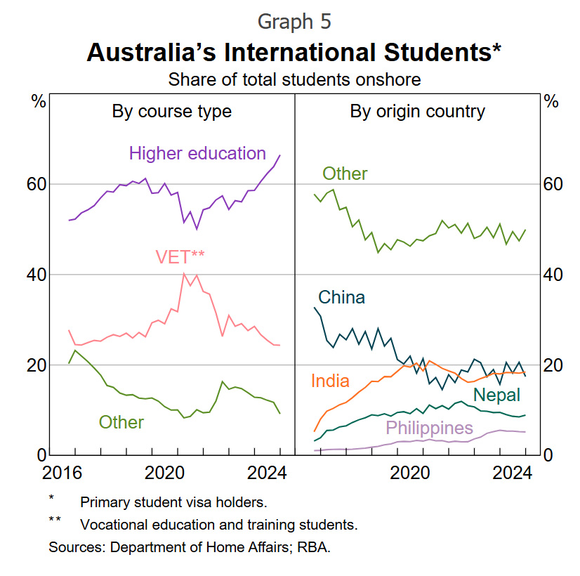 As the student stock has recovered, the share of international students studying higher education courses has risen, while the share studying vocational education and training (VET) and other types of courses has declined. Most international students are from Asian countries, with Chinese and Indian students making up close to two-fifths of those studying higher education courses (Graph 5).