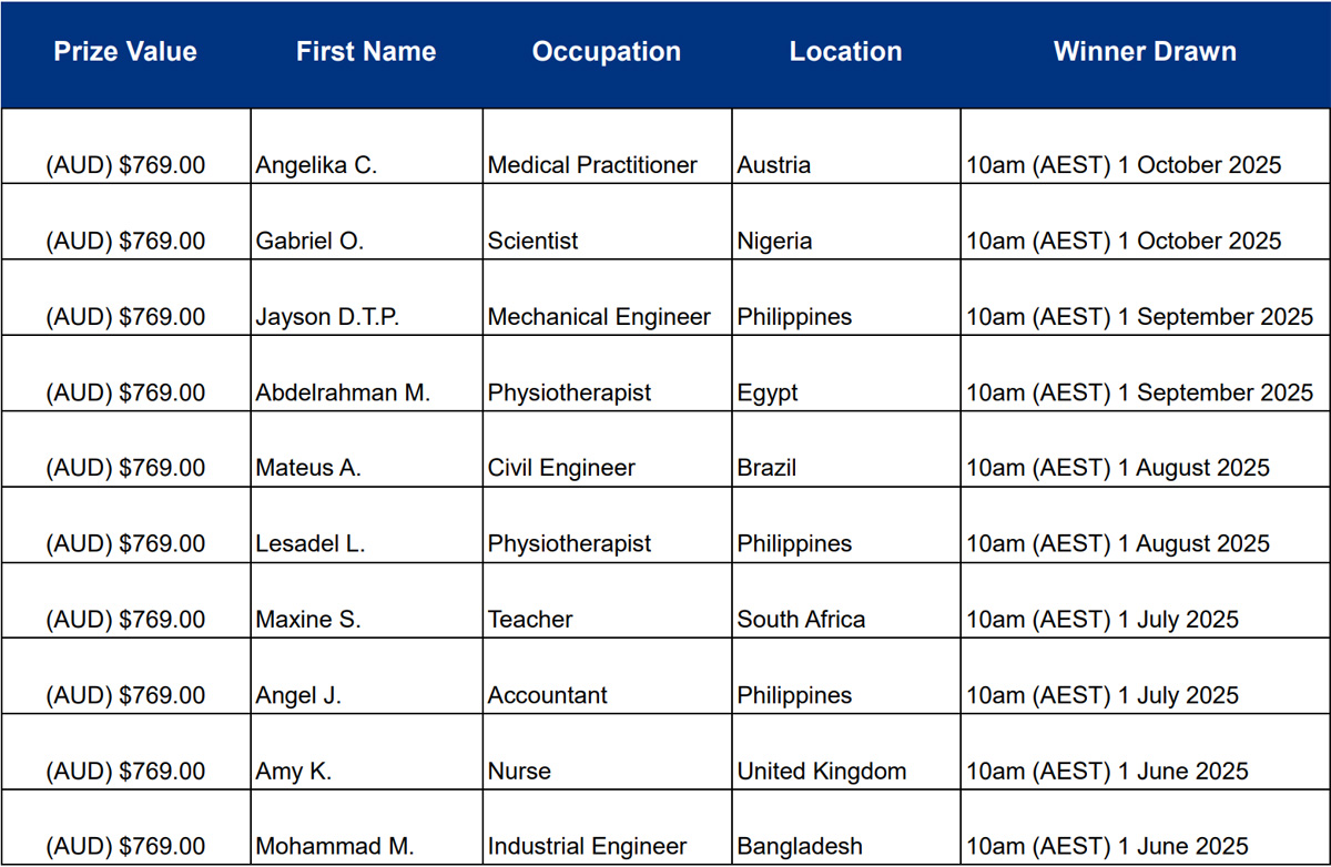 The next 2 lucky winners will be drawn at 10am AEST on 1st November 2025.